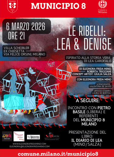 “Le Ribelli Lea e Denise”, performance, anteprima nuova produzione, matinée, Scuole torinesi (TO). Segue presentazione del libro “Il diario di Lea”, dedicato a Lea Garofalo (MINO-SALZA), edito da Navarra Editore